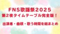 別記事「FNS歌謡祭2025第2夜タイムテーブル完全版!出演者・曲順・歌う時間を総まとめ」で詳しく整理しています。