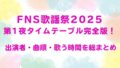 別記事「FNS歌謡祭2025第1夜タイムテーブル完全版!出演者・曲順・歌う時間を総まとめ」で詳しく整理しています。